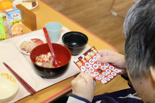 皆さん、食事の手を止めて画面に映し出された番号と手元のビンゴカードを真剣に見比べておられました。