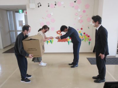 (現在ピアサポートあいとメイプル福野は休業中にて、なんと共同作業所の利用者の方が代表して寄贈を受けました。)