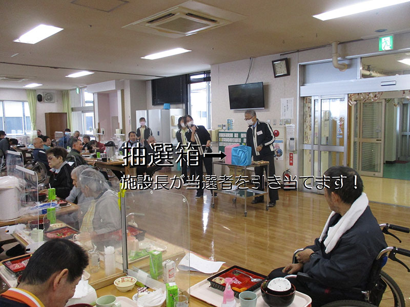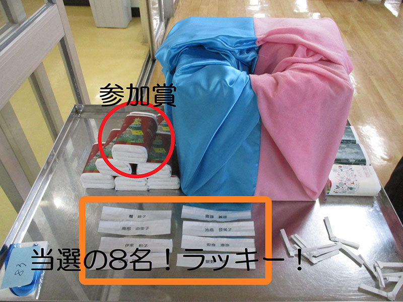 ☆かわりに抽選会を実施しました。施設名の八乙女にちなみ、八名のかたに当選の景品(泡立ちタオル)をプレゼントしました!選に漏れた方には参加賞としてクリスマスデザインのポケットティッシュをプレゼントしました。
