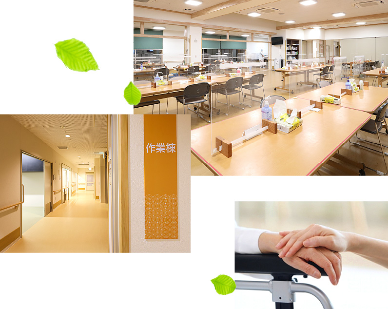●それぞれの障がいにあわせて作業を行います。 (作業は午後3時まで) 個別面談を通して、更なる作業時間の調整も行います。 ●入浴、排泄、食事の介助、日常生活における便宜、創作的活動を提供します。 ●午後3時以降は、余暇・趣味的活動とします。 静養や身辺整理も可能です。 ●看護サービスや必要性に応じたリハビリを提供します。 |